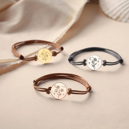 Crafted as a timeless family treasure, our personalized bracelet features a delicate disc adorned with up to 5 birth flowers, each bloom representing a loved one, always growing together from the same roots. This thoughtful piece of personalized jewelry for mom is a sentimental gift that symbolizes the strength of family bonds.