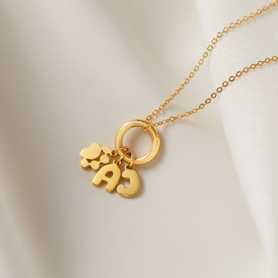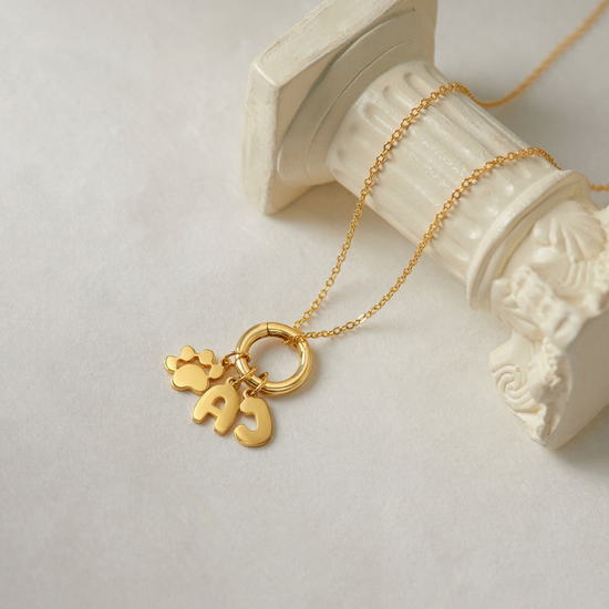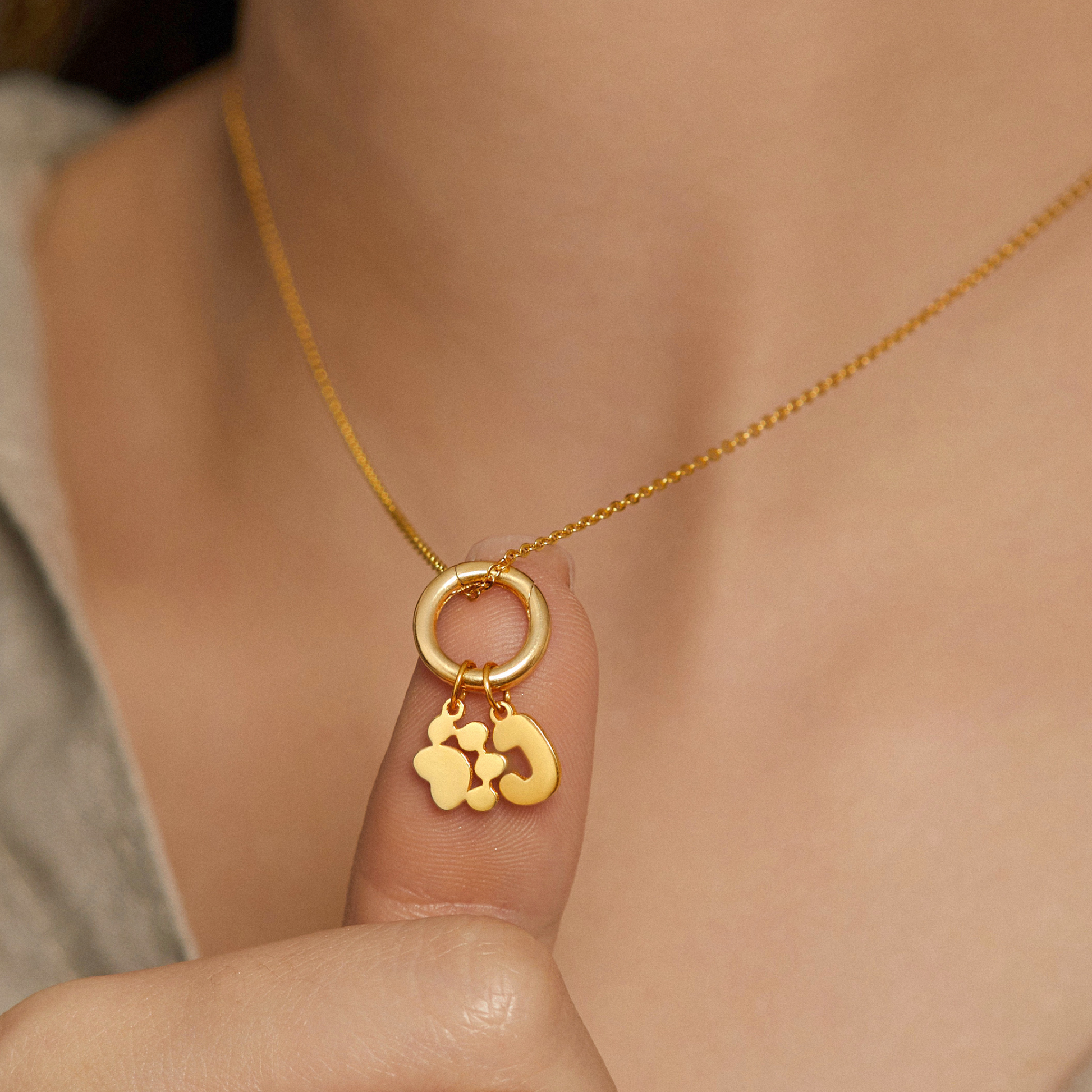 Celebrate your furry companion with this charming pet initial necklace, designed with love for devoted pet lovers. Featuring a playful paw print charm alongside personalized initials, it’s a sweet reminder of the bond you share. The sleek ring connector and delicate chain add a modern, stylish touch to your everyday look. Whether worn solo or layered, it keeps your pet close to your heart in the most adorable way. A thoughtful gift for yourself or any proud pet parent.