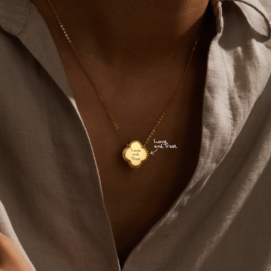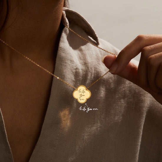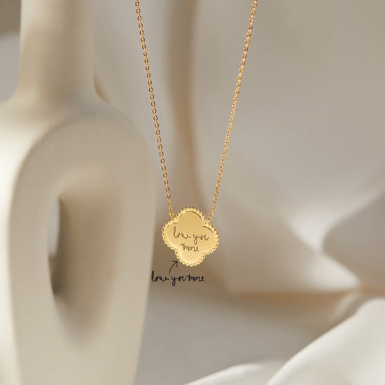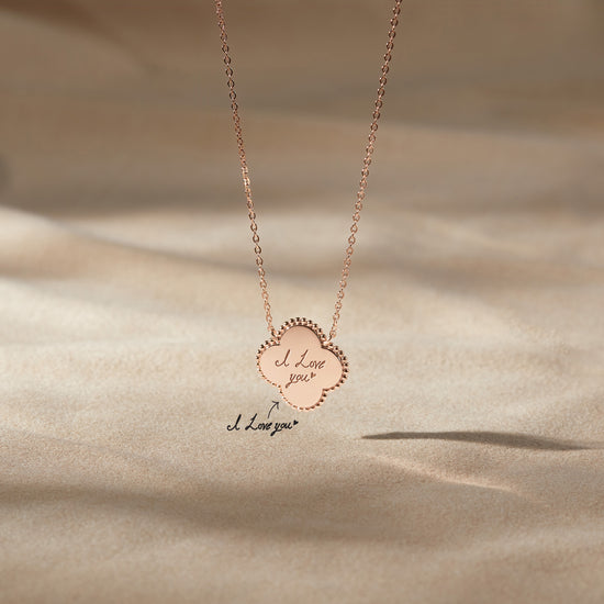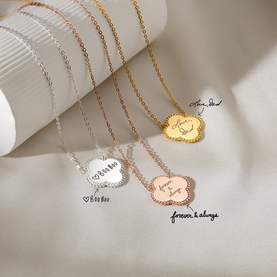 Carry a bit of luck and love with our Handwriting 4 Leaf Clover Necklace, a unique piece of Handwriting Jewelry that’s both meaningful and stylish. This beautiful 4 Leaf Clover Necklace features your loved one’s handwriting engraved onto a delicate clover pendant, making it a truly personal and heartfelt Keepsake Gift. Available in sterling silver and gold, this Clover Necklace Gold symbolizes good fortune while preserving the memory of someone special.