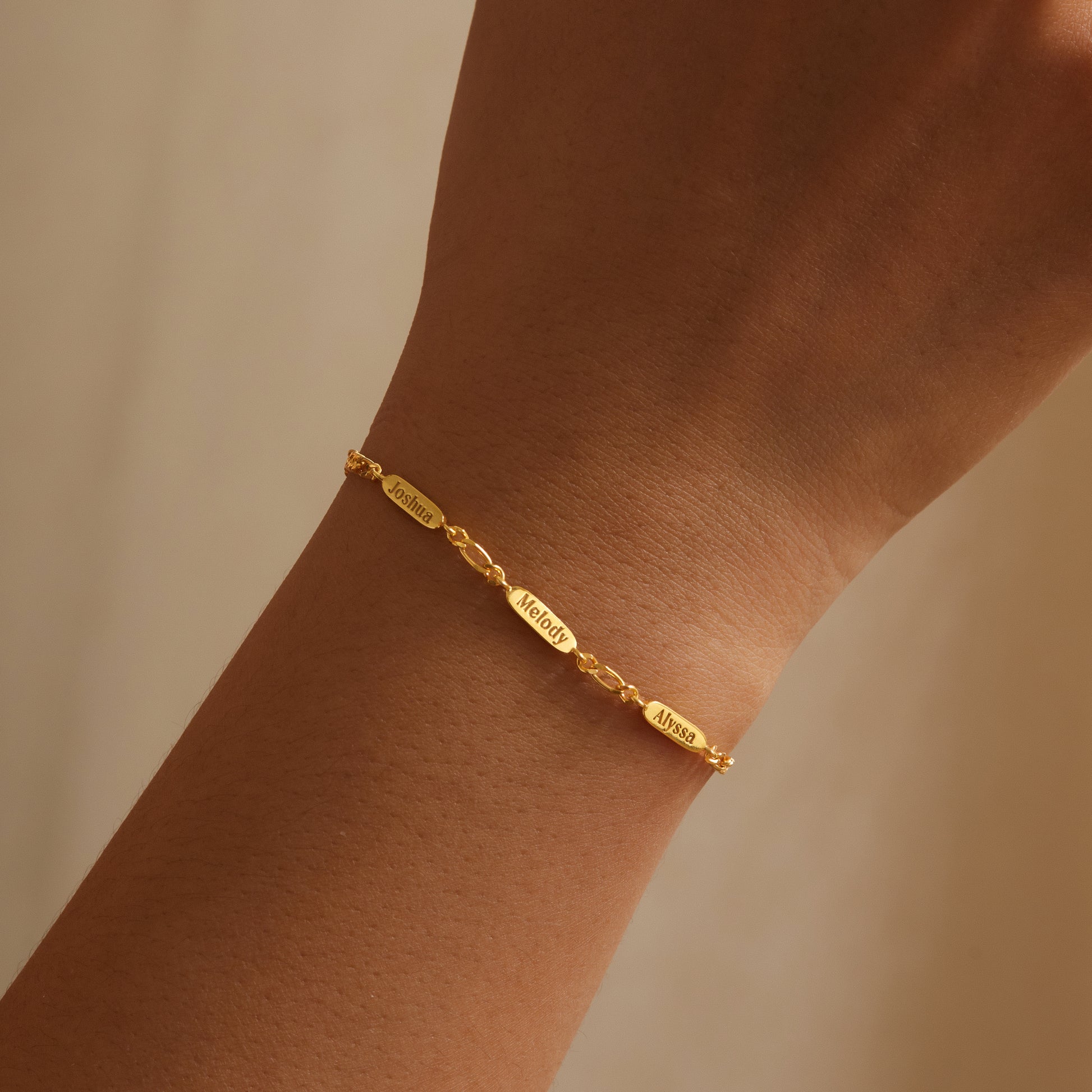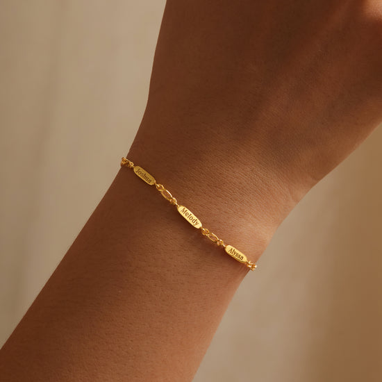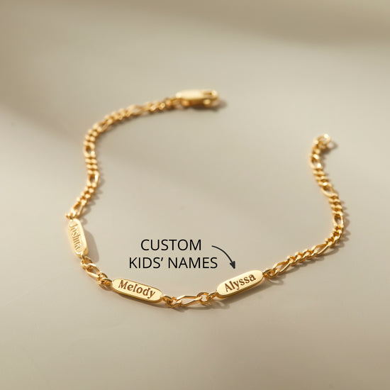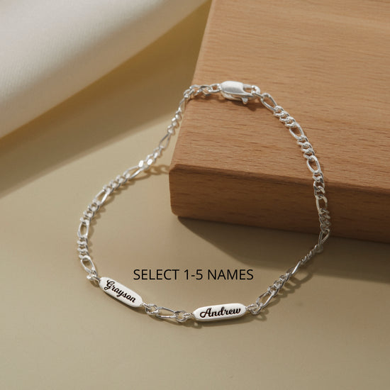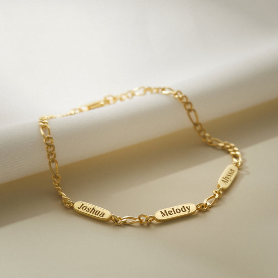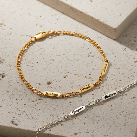 A timeless bracelet designed to celebrate the bond that connects family through generations. Crafted with a delicate Figaro chain, this elegant piece features personalized name charms engraved on both sides — each one representing a loved one held close to the heart. Thoughtfully made from high-quality materials, it blends sophistication with sentimental value, making it a perfect accessory for both casual and special occasions. Whether given as a gift to a mother, grandmother, or cherished family member, this bracelet beautifully captures the essence of love, connection, and legacy in every detail.