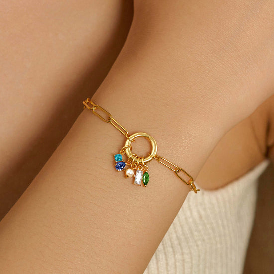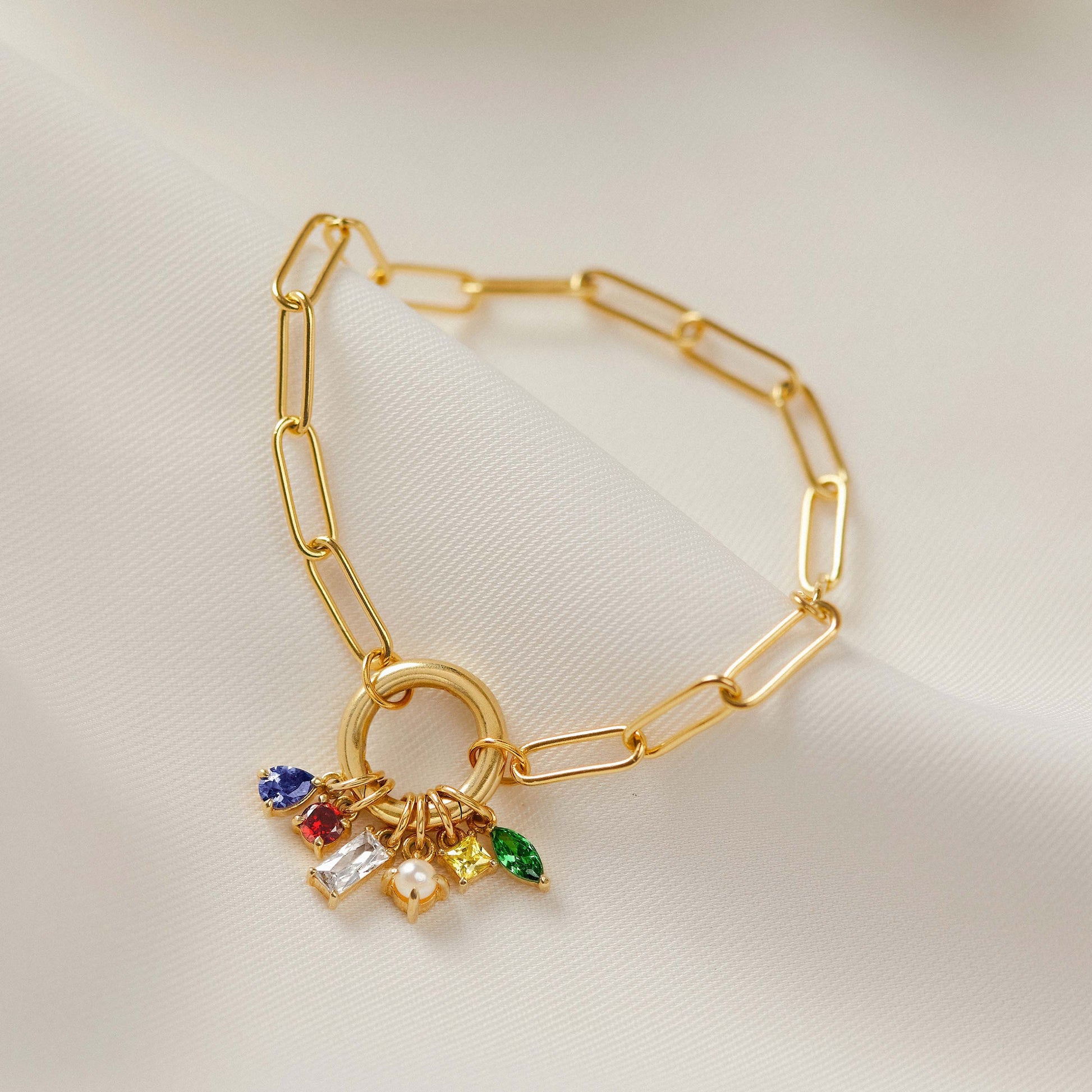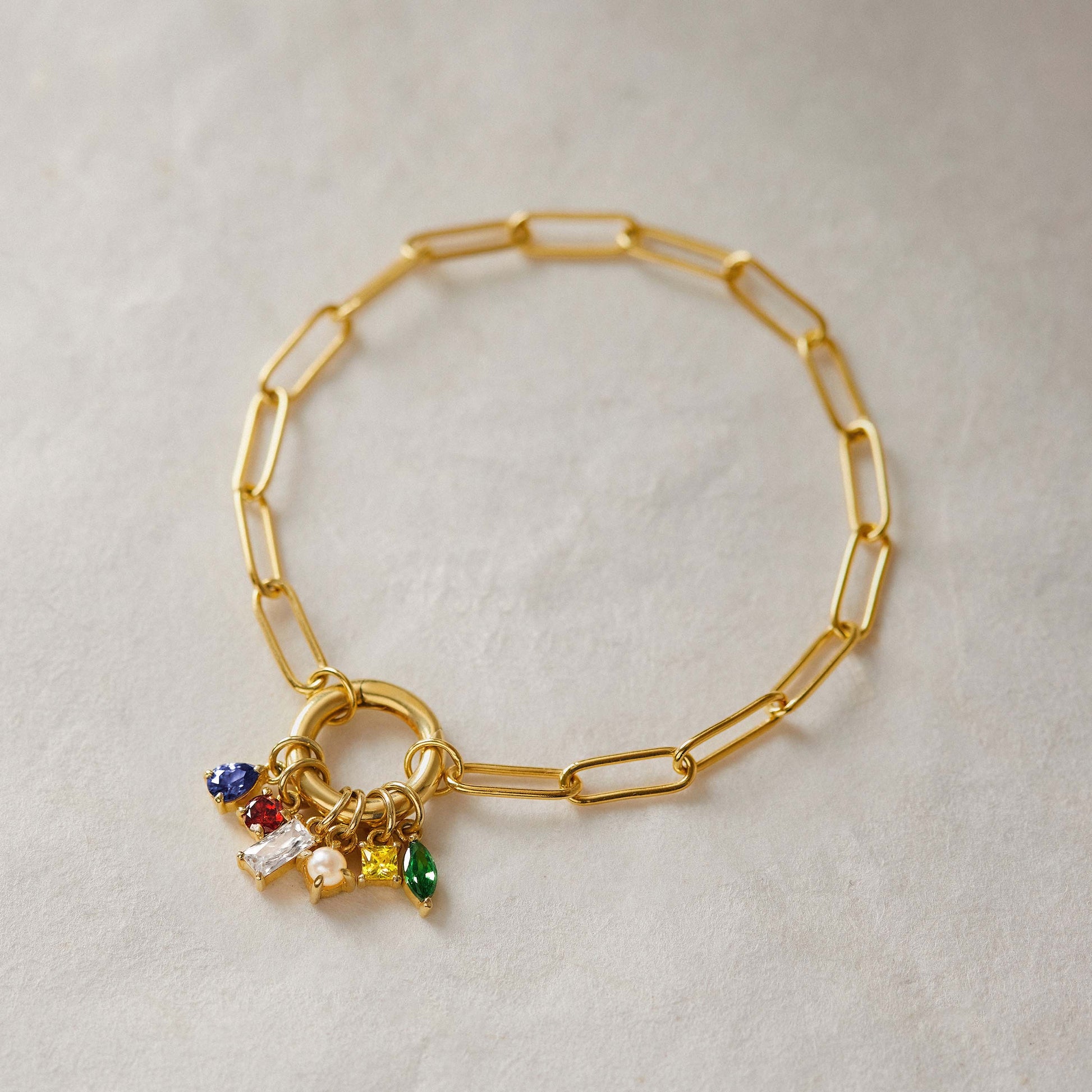 Celebrate mom with this elegant birthstone charm bracelet, personalized with multiple gemstones representing her loved ones. The gold chain features a stylish link design, making it a timeless and meaningful keepsake. Each gemstone charm adds a unique, colorful touch, symbolizing family connections and cherished memories.