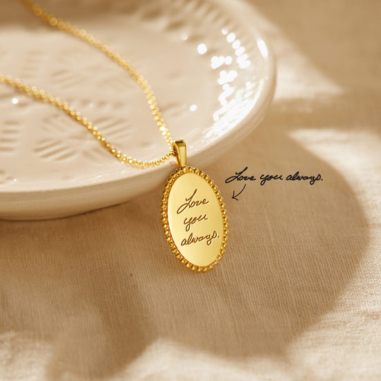 Our personalized handwriting necklaces are a loving way to keep someone close to your heart: your child, your partner or a loved one who has passed away. This also can be engraved on the back side.